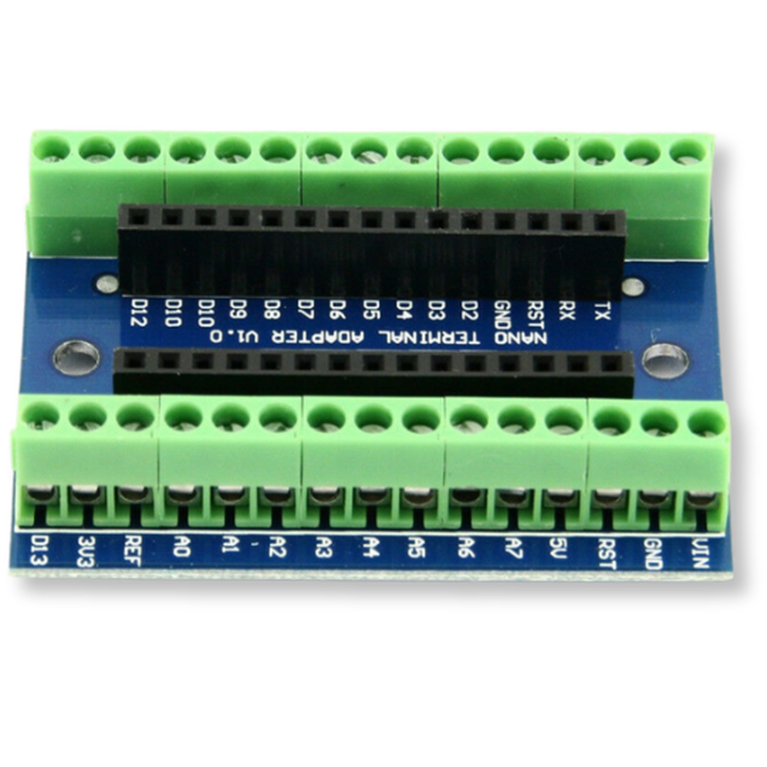 Arduino Nano compatible adapter makes it easy to connect to external devices and features screw terminals. It is a small, simple expansion board. It works with both version 3.0 and older Arduino Nano boards. The IO expansion board allows convenient connection of the microcontroller to other devices. It has a terminal with 30 ARK connectors.