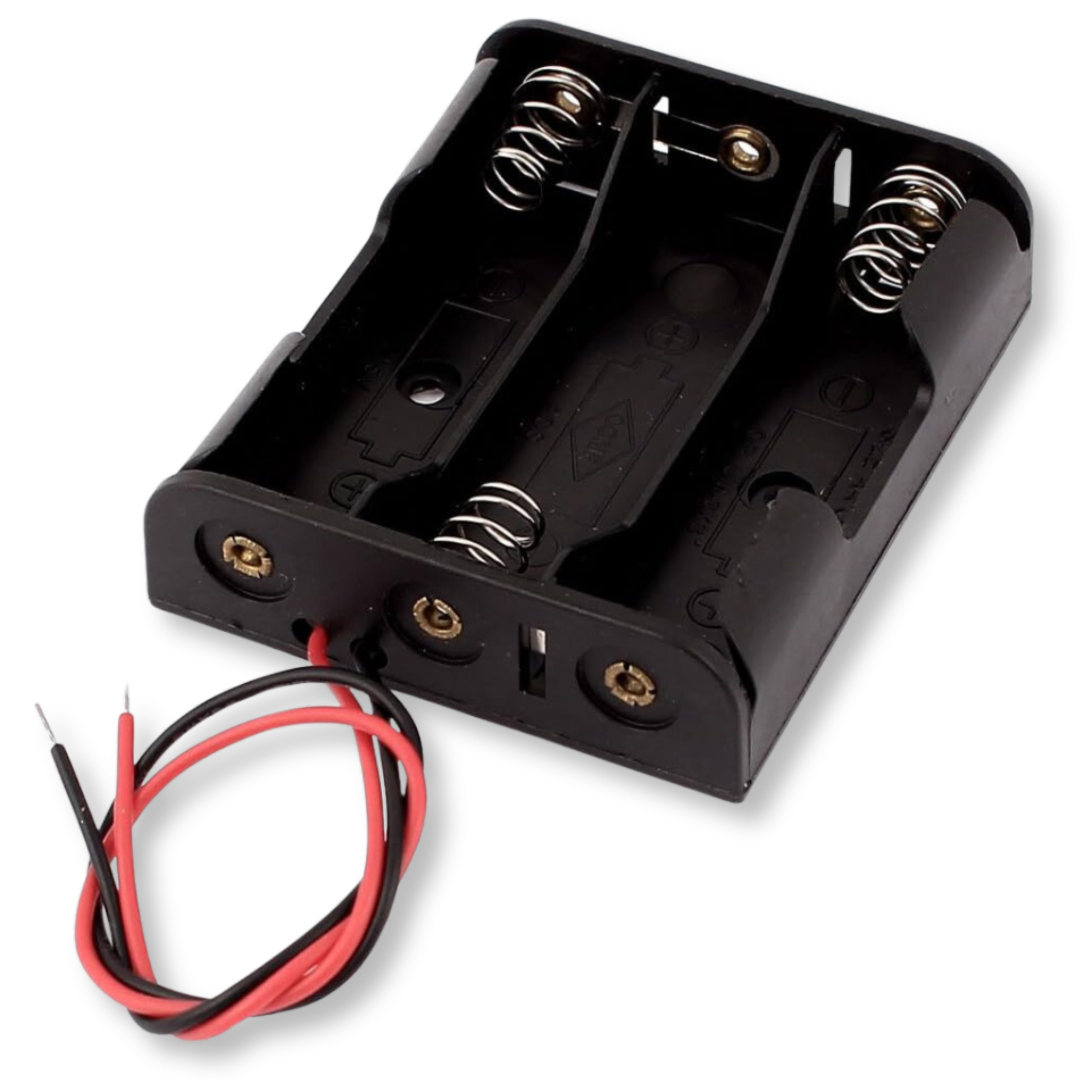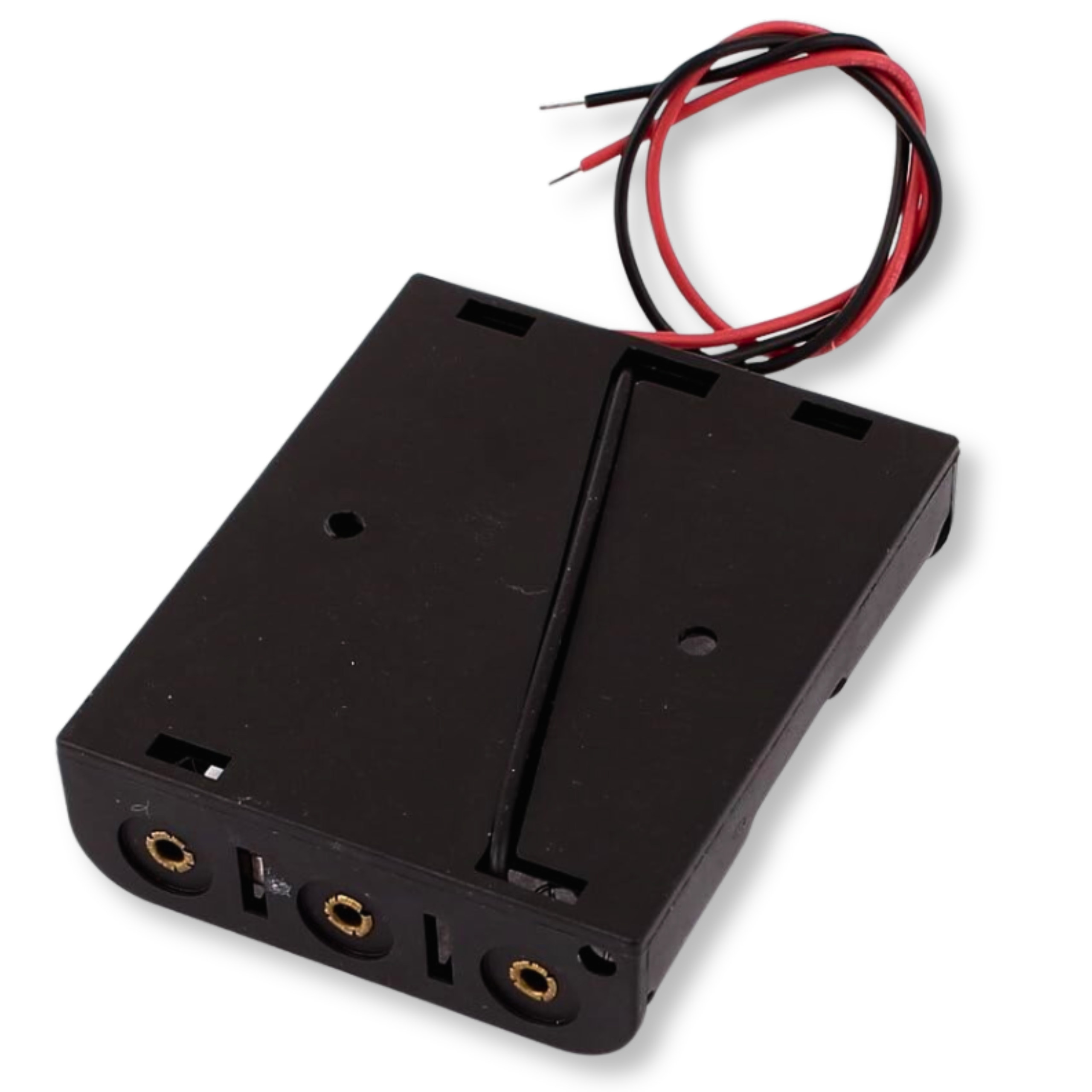 This 18650 battery holder allows safe and convenient use of three cells connected in series. It is a reliable solution for electronic projects requiring a stable power source at 10.80V. Contoured plastic and retaining springs ensure firm and secure cell seating.