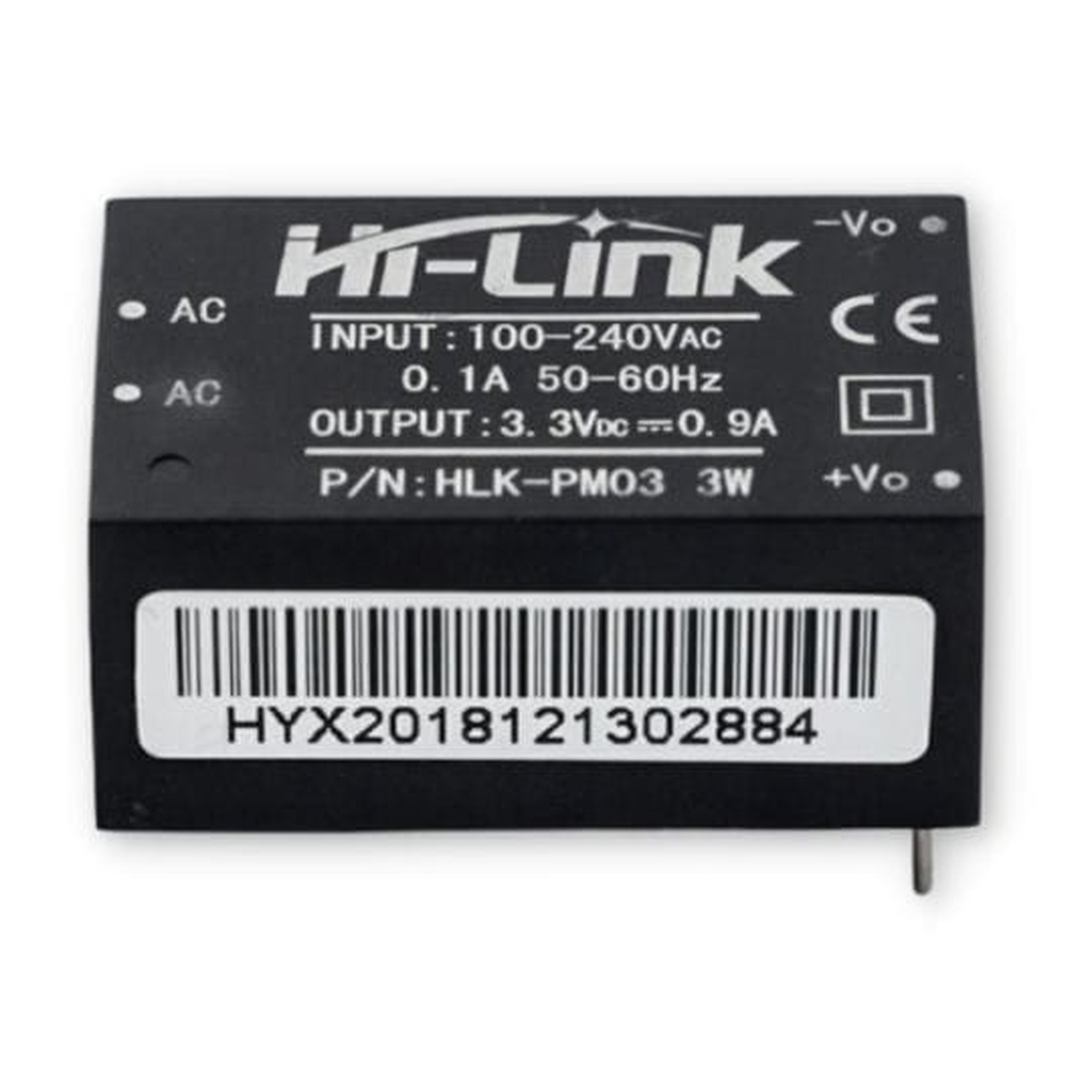 HLK-PM03 is a miniature power supply that accepts 100-240V AC input and delivers stable 3.3V DC with an output current capability of 0.9A. This compact module occupies far less space on PCBs than traditional PCB-mount transformers. This version is intended for direct soldering onto the printed circuit board. It works excellently as a power source in a wide range of electronic applications, including ESP8266, ESP32, Arduino, and Raspberry Pi.