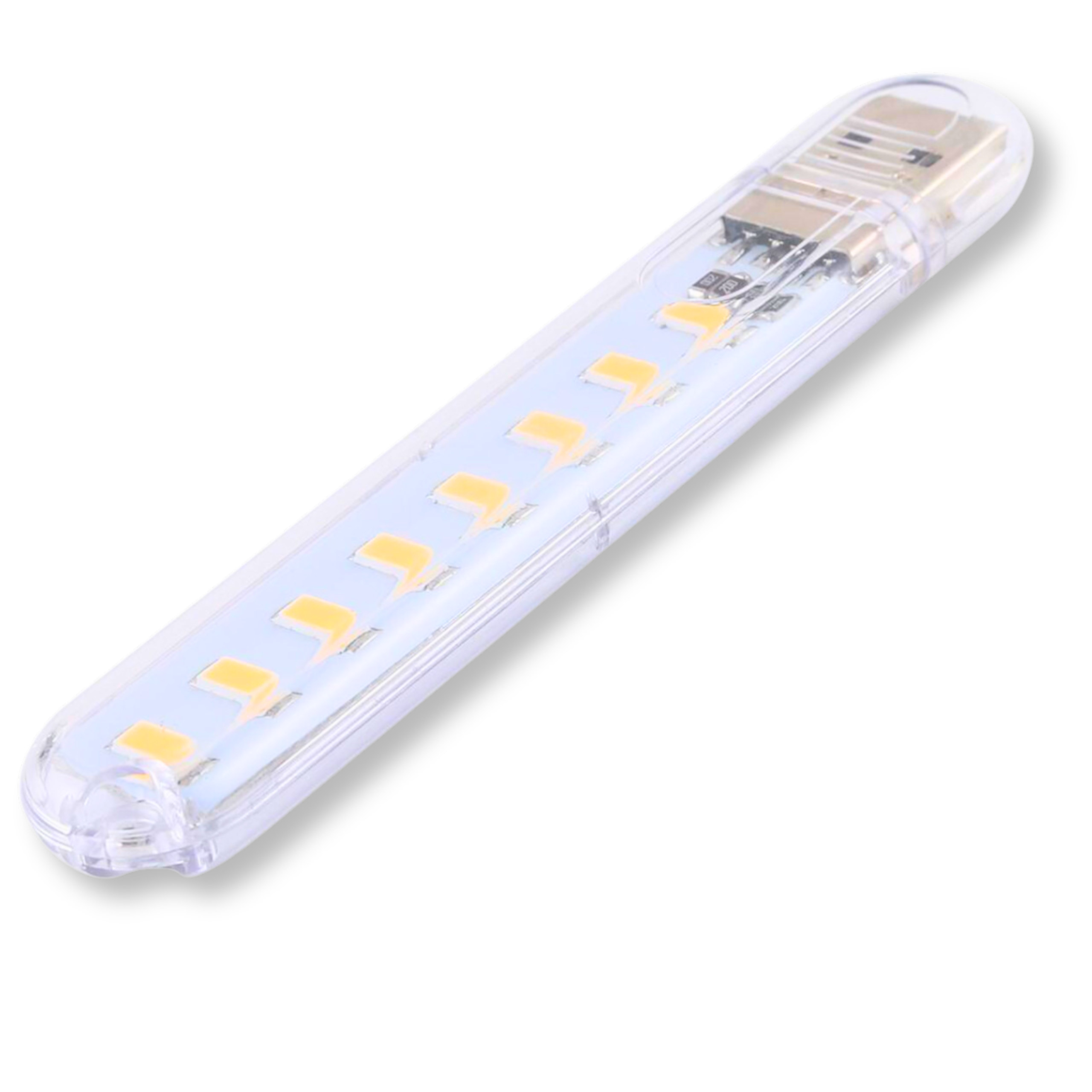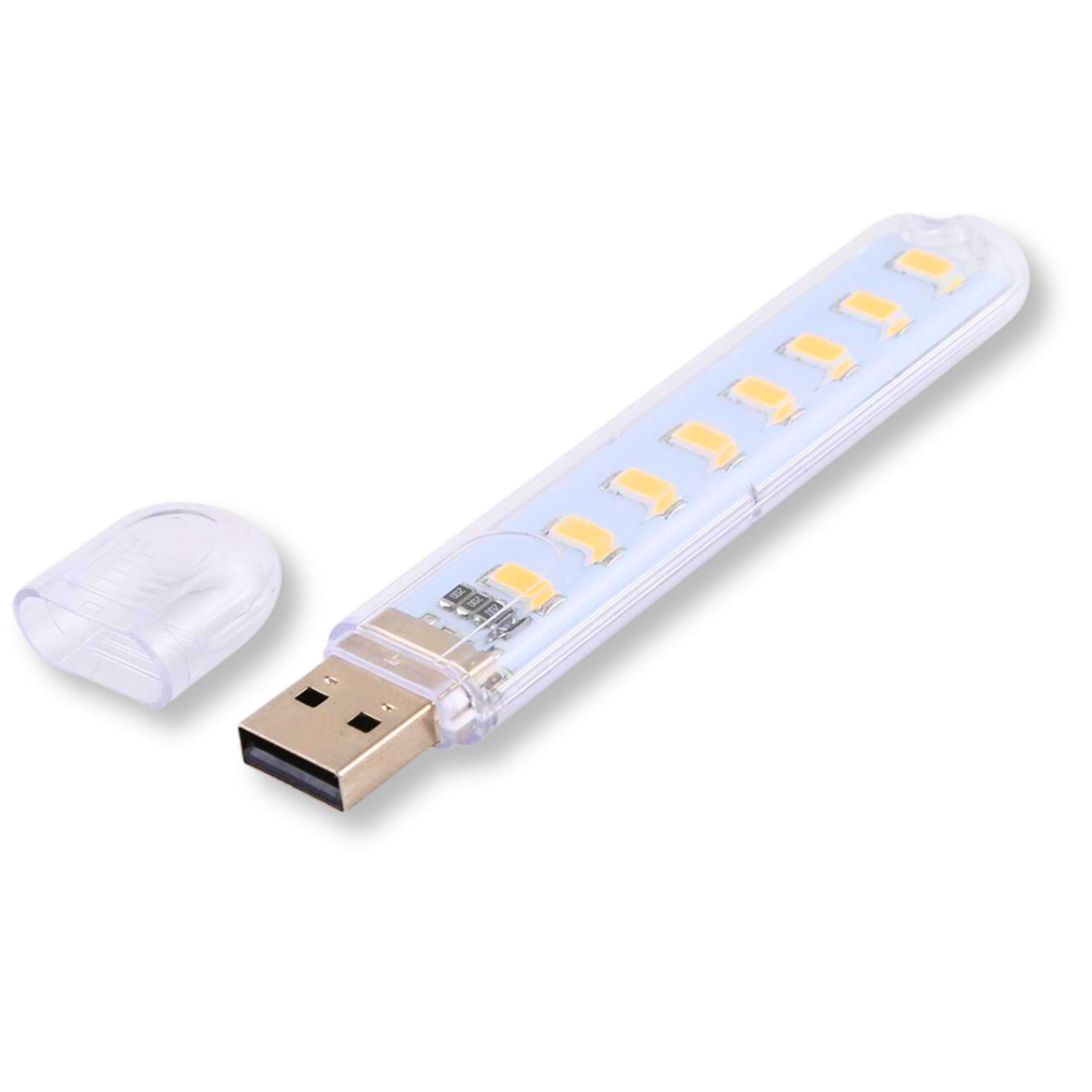 This compact USB lamp is a convenient light source in many situations. Powered from a standard USB port and using eight LEDs that emit warm light, it works well at home, in the office, and while travelling.
