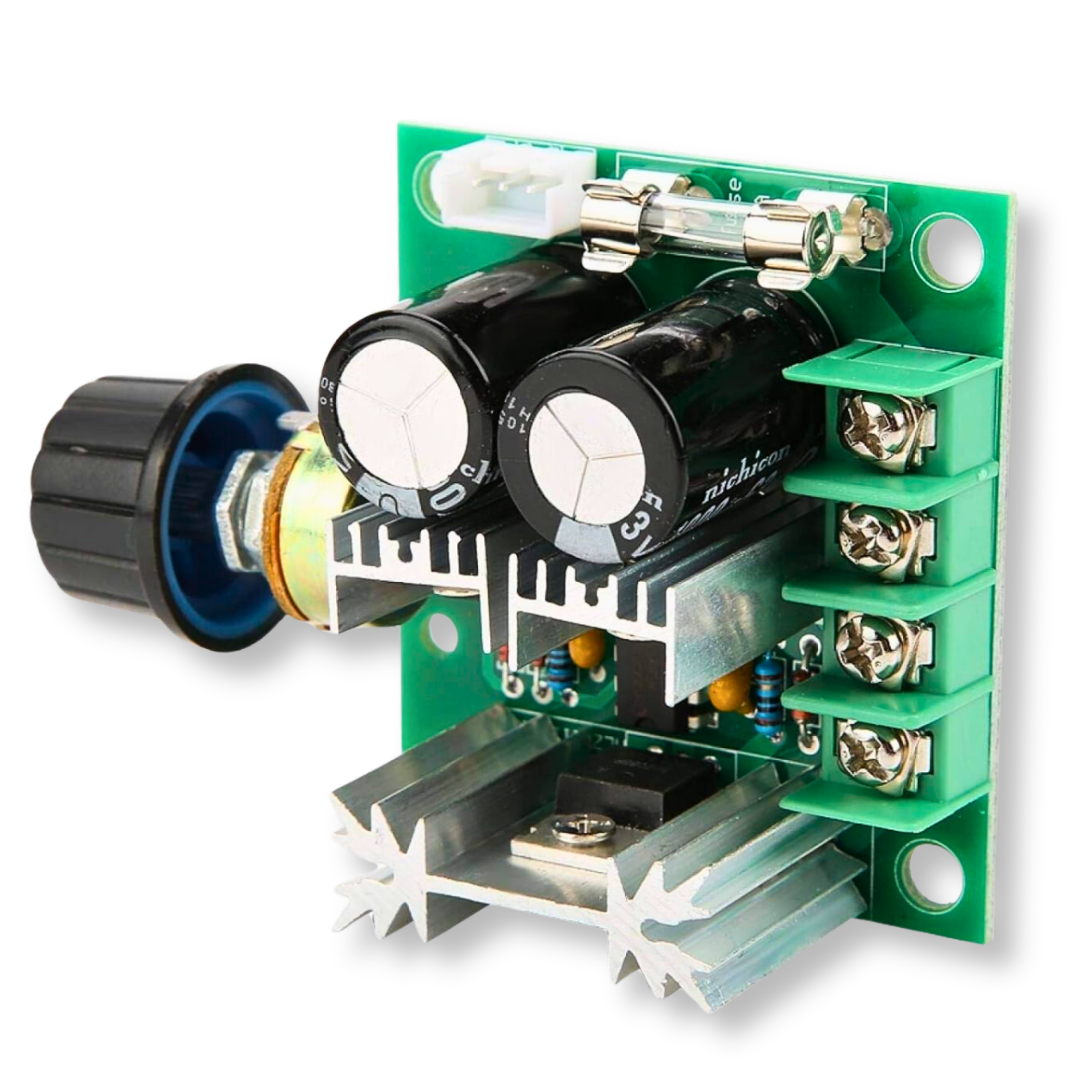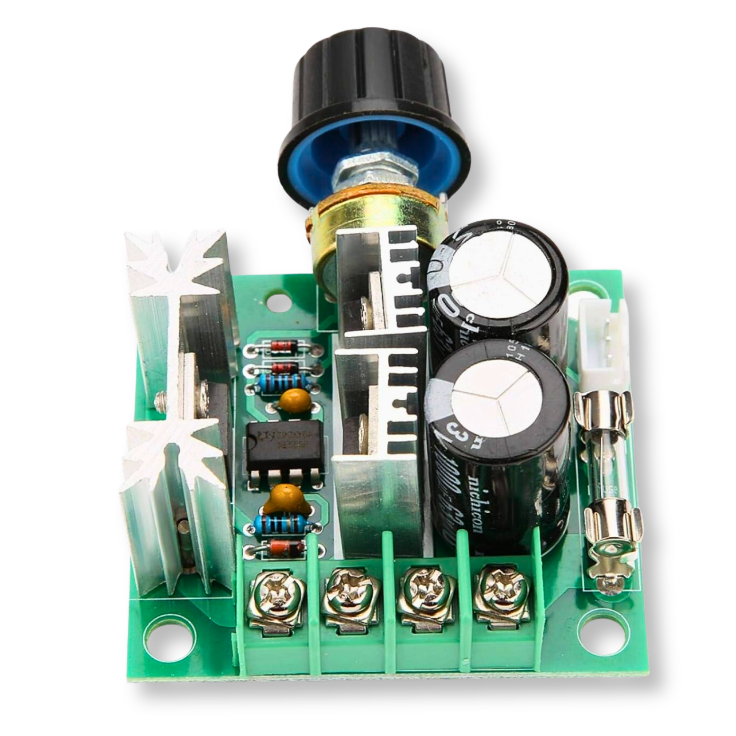 The PWM controller enables precise speed control of DC motors, control of proportional valve coils and other consumers using a pulse width modulated (PWM) signal. It operates at voltages from 12V to 40V DC, supporting a maximum current of 10A and providing an output power of up to 400W. The control range is 10% to 100%, and adjustment is via a potentiometer. The module is fitted with a 10A fuse and its dimensions are 56mm x 60mm x 29mm (excluding the potentiometer knob).