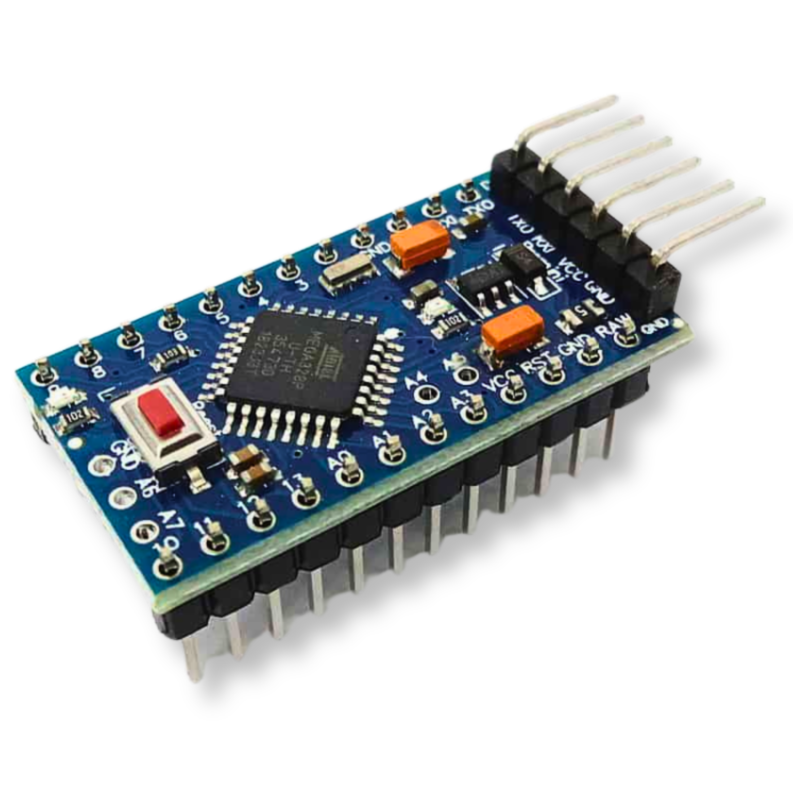 The Arduino Pro Mini-compatible microcontroller offers fast operation at 16MHz clock speed, is powered by 5V and is based on the proven ATmega328P. It is smaller than the popular Arduino Uno, but provides a large number of leads. It has 32kB of FLASH memory and 2kB of RAM for efficient resource management. The Arduino Pro Mini features 14 digital inputs/outputs, 6 of which can operate as PWM, and 8 analogue inputs, while supporting the most popular interfaces such as UART, I2C and SPI. Goldpin connectors are also included for easy assembly and expansion.