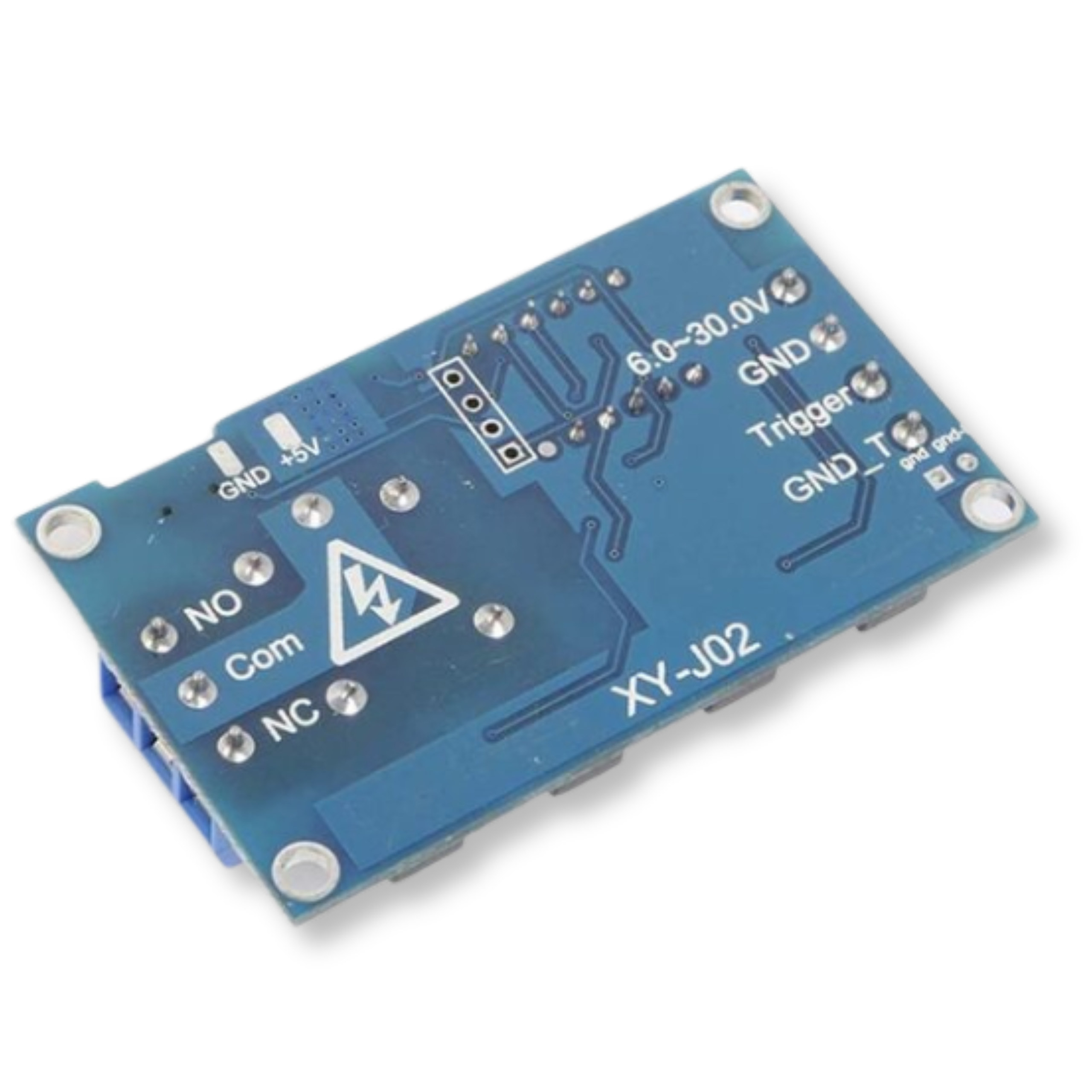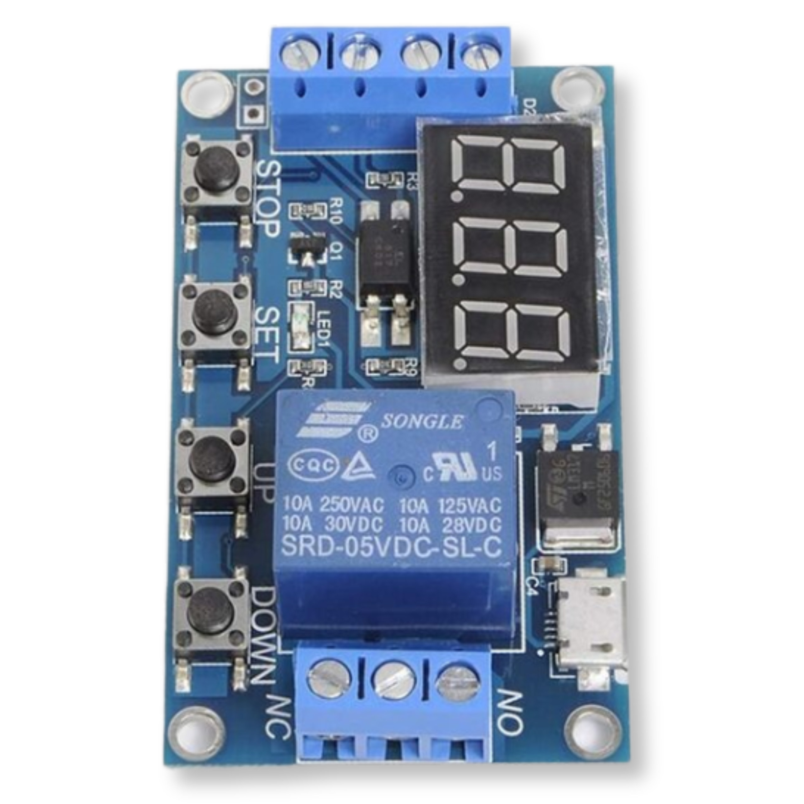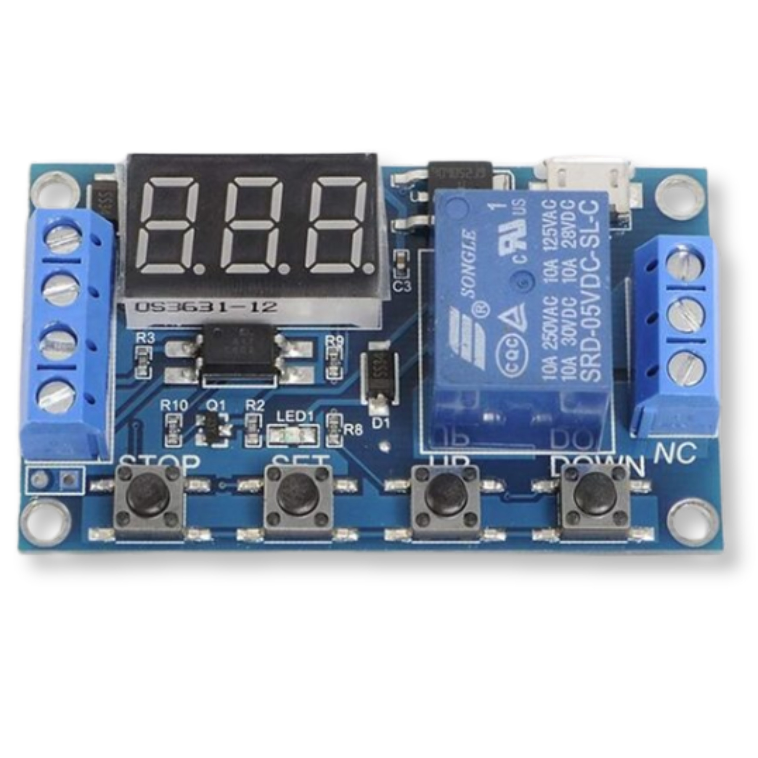 The module is easy to use with four intuitive buttons. It has a clear display and an LED indicating relay activation. The trigger port allows starting and stopping the countdown, continuous operation, and cyclic relay on/off switching.
